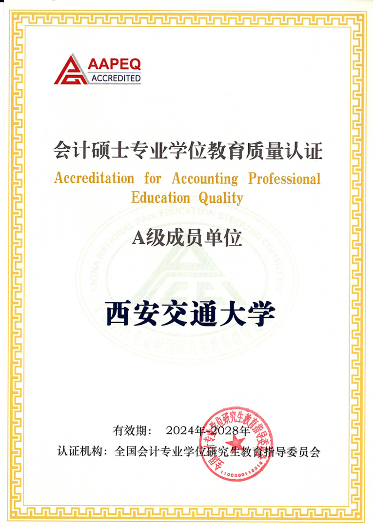 会计专业学位教育质量认证(Accreditation for Accounting Professional Education Quality,简称“AAPEQ”)是由会计教指委对会计专业学位培养单位的会计硕士专业学位项目进行的教育质量认证。会计教指委依据AAPEQ认证指标体系对培养单位会计专业学位教育的现状与发展前景持续进行全面评价,并给出认证结论等级。认证分为A级(优秀通过)、B级(通过)、C级(不通过)3个等级,截止2025年5月,全国共有20家培养单位为A级成员单位。AAPEQ认证程序包括4个阶段:资格申请、认证准备、认证评审、维护评审。