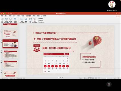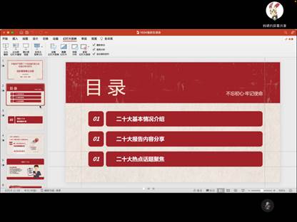 首先,韩啸同志带领大家学习二十大会议内容,向大家传达二十大精神。韩啸同志从二十大基本情况介绍、二十大报告内容分享和二十大热点话题聚焦三个方面来展开介绍。二十大基本情况介绍包括会议日期、地点、议程和参会代表的基本情况。总的来说,二十大当选代表的结构和分布都非常合理,充分体现了党内民主和人大代表的广泛代表性。在二十大报告内容分享中,韩啸同志带领大家详细地回顾了二十大的工作总结、新时代的使命任务与未来的具体发展方面。新时代新征程中国共产党的中心任务,就是团结带领全国各族人民全面建成社会主义现代化强国、实现第二个百年奋斗目标,以中国式现代化全面推进中华民族伟大复兴。在二十大热点话题聚焦这一部分,韩啸同志集中介绍了二十大a漫召开的五场招待会中关注的内容。