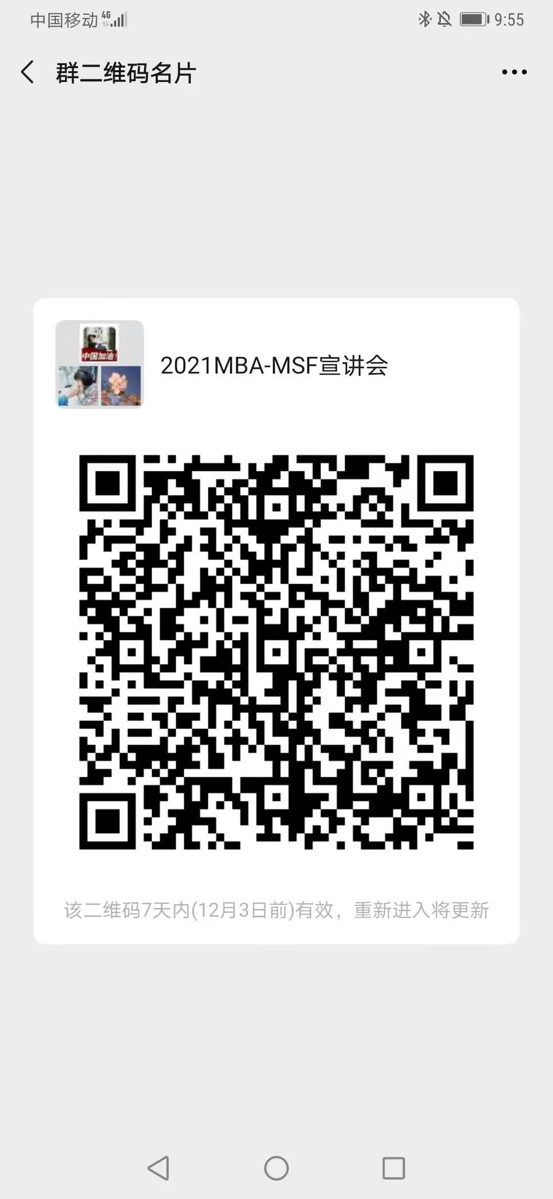为帮助学员更为全面、准确了解a漫 MBA- MSF双学位项目招生政策,使考生更加清晰、高效地完成准备,现定于12月7日(周一)晚上19:00,在线进行招生宣讲了解招生政策,进行答疑解惑。欢迎有意向的学员踊跃参加,扫描以下二维码入群: