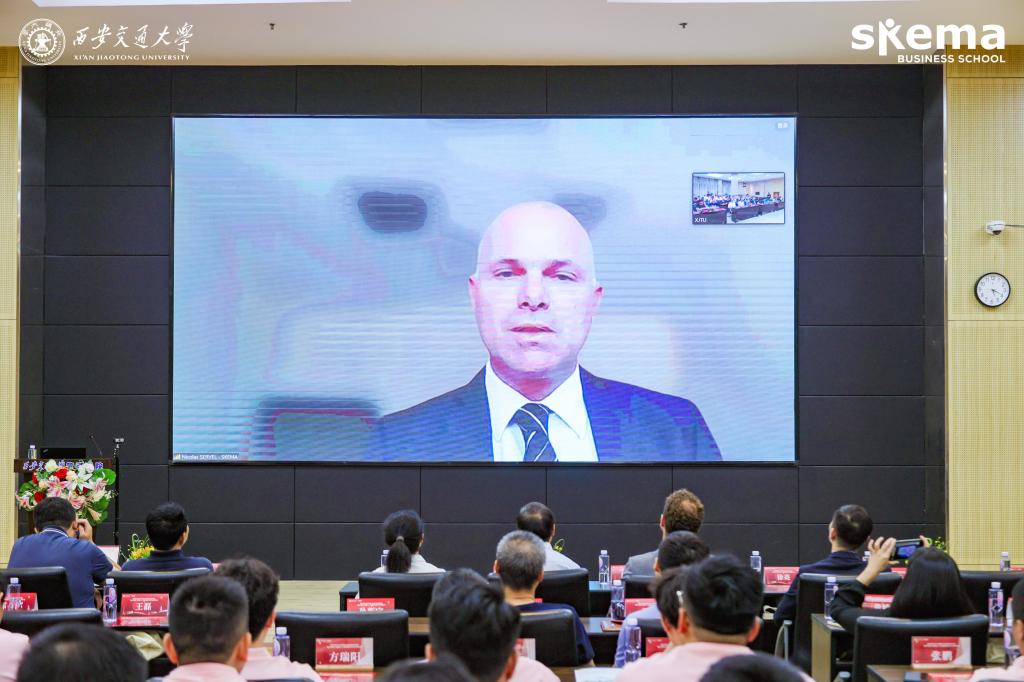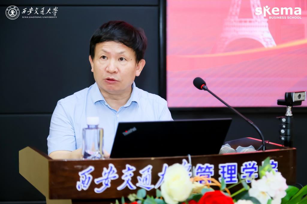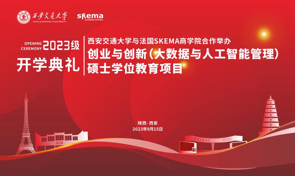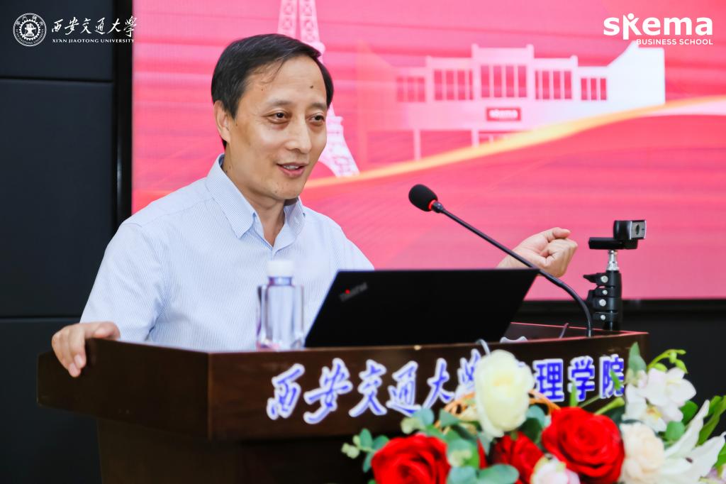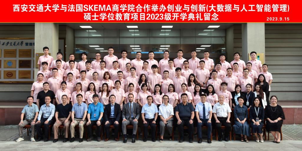 The School of Management of Xi’an Jiaotong University hosted the 2023 opening ceremony for joint Master of Science Program in Entrepreneurship and Innovation (Big Data and Artificial Intelligence Management) between XJTU and SKEMA Business School on September 15 in Xi’an. Ma Xiaobin, Secretary of the School of Management Party Committee, Liu Wenfeng, Director of Department of International Cooperation and Exchanges, Zhang Yan, Associate Director of Department of Continuing Education, Tian Gaoliang, Associate Dean of the School of Management, and Patrice Houdayer, Vice President of SKEMA Business School, Matthieu Dumont, Director of SKEMA Suzhou Campus, Nicolas Servel, Director of the MSc Entrepreneurship & Innovation Program of SKEMA, XU Liang, Academic Director of the Joint Program in China, represented Xi’an Jiaotong University and SKEMA Business School respectively, attended the ceremony and delivered speeches to celebrate the exhilarating brand new study journey for the fourth cohort of the joint MSc program students. The opening ceremony was hosted by Professor Shu Chengli, Assistant Dean of the School of Management and Director of the Center for International Programs.