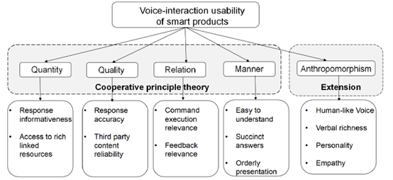 研究对语音交互可用性维度体系的构建,发展了人机交互情境下的会话合作原则理论:用户与智能产品要实现有效的语音交互,需要满足包含数量、质量、关联性、方式与拟人性等五项原则,每项原则又分别含有24个子原则维度。如图1所示。