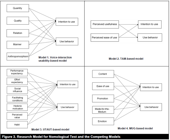 研究对开发的量表进行了预测效度的检验,将研究开发的语音交互可用性模型与信息系统领域经典模型包括TAM模型、UTAUT模型、MUG模型等进行了实证比较,如图3所示。数据检验结果发现在人机智能语音交互的场景下,本研究开发的维度变量表现出更高的预测性,优于传统模型的解释性。开发量表的预测效度比较分析如图3所示。