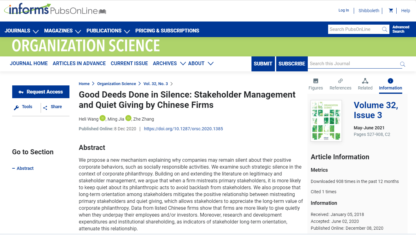 张喆教授团队针对上述问题展开研究,并以《中国企业的利益相关者管理和沉默捐赠》(Good Deeds Done in Silence: Stakeholder Management and Quiet Giving by Chinese Firms)为题将此项研究发表在《组织科学》(Organization Science)上。该研究探究了亏待主要利益相关者(mistreated stakeholders)的企业更可能对其慈善行为保持沉默的问题,对现有文献做出了三方面突出贡献:第一,该研究拓展了战略性沉默(strategic silence)领域的研究,即基于合法性和利益相关者管理视角,为企业做慈善后保持沉默的行为提供了全新的解释;第二,已有研究普遍认为企业应该宣传其慈善行为,并没有关于企业做慈善后保持沉默的研究,该研究通过理论和实证的分析填补了这一空白;第三,该研究挑战传统思维而认为利益相关者并不总是会对企业慈善持有积极评价。