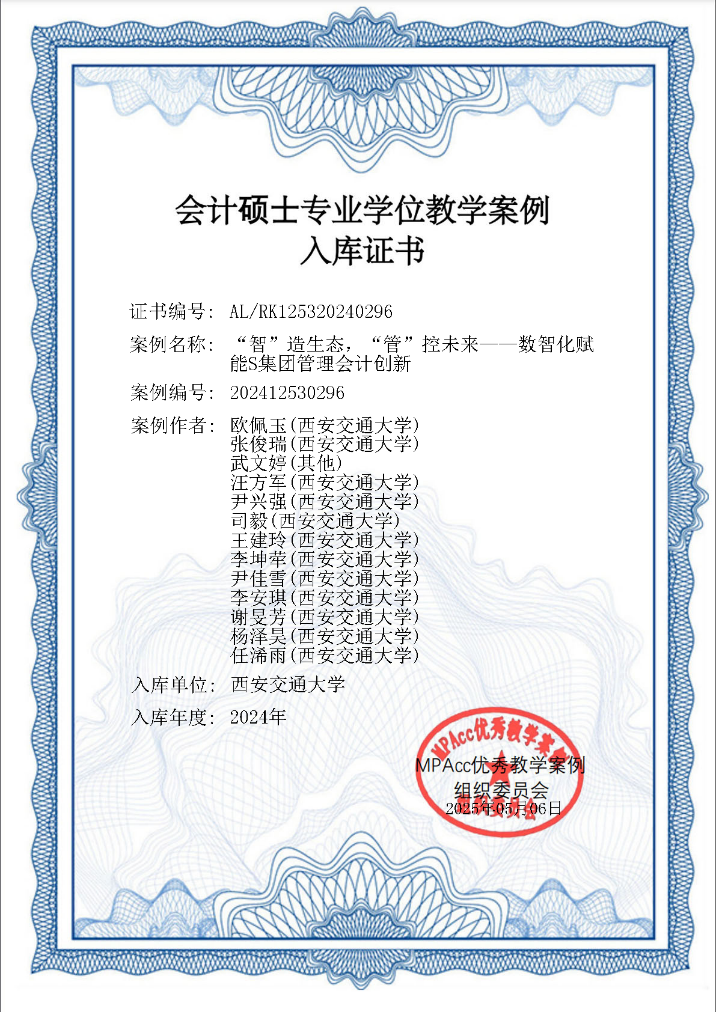 喜报一:欧佩玉副教授、张俊瑞教授、汪方军教授等撰写的教学案例《“智”造生态,“管”控未来——数智化赋能S集团管理会计创新》获评会计硕士专业学位优秀教学案例(每年共30篇)。