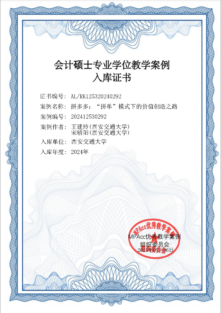 喜报二:王建玲教授等撰写的教学案例《拼多多:“拼单”模式下的价值创造之路》入选会计硕士专业学位教学案例库。
