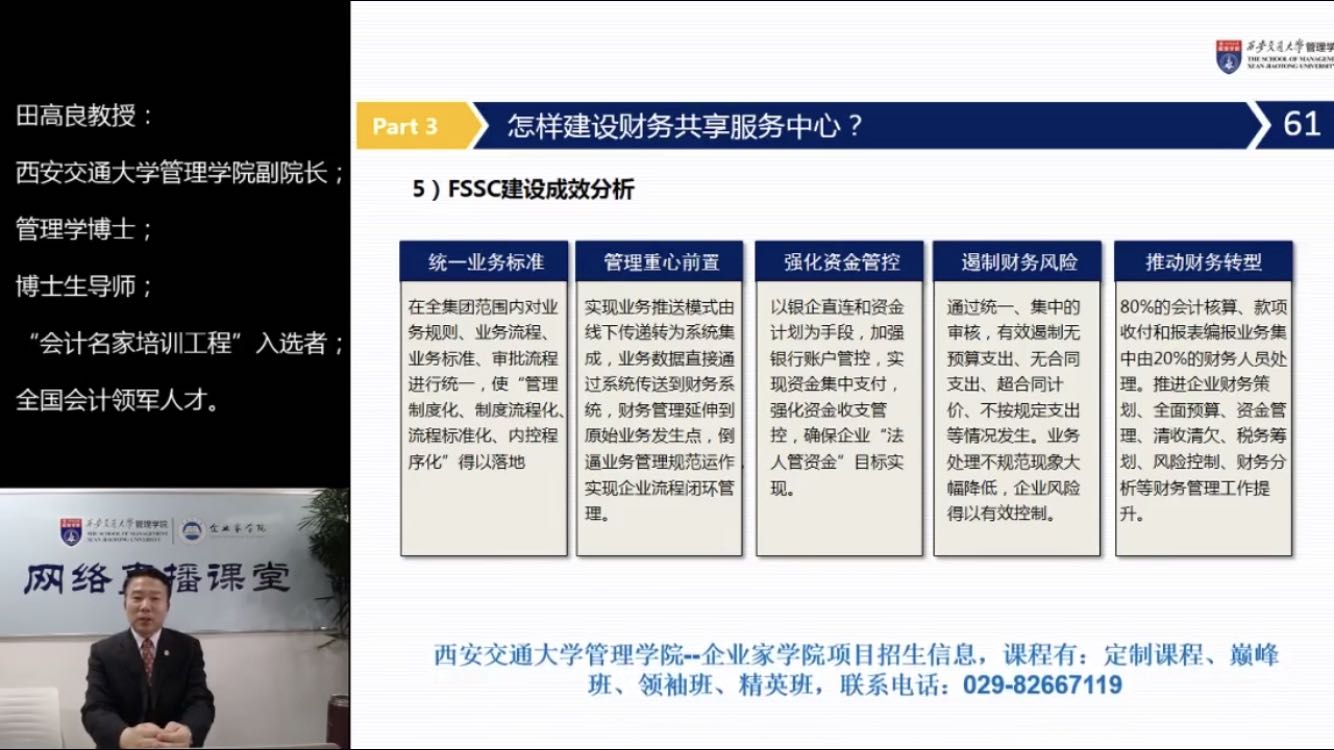 3月26日晚8点大讲堂直播培训正式开始。田高良教授以大数据、人工智能、移动互联网和云计算等信息技术的交融渗透对社会经济运行模式乃至企业管理模式带来颠覆式的影响为切入点,为大家介绍了“大智移云”背景下财务会计理论与实务的变革之道,进而为数字经济下的财务会计管理体系推广与运用提供了新的思路,即建设财务共享服务中心。强调企业必须把握好数字化、网络化、智能化的发展机遇,充分吸收新技术赋予的新能量,及时实现财务转型,从高速度扩张向高质量发展转变,由管控型财务向赋能型财务转变,由流程驱动向数据驱动转变、由财务分离向财务融合转变,从守护价值向创造价值转变。田教授通过《2019年中国共享服务领域调研报告——基于中央企业财务共享服务建设情况》中的经典企业财务案例,向大家详细介绍了财务共享服务中心特征、运营模式和未来发展方向,以及针对建设运营中出现的主要问题所采用的解决方案,为大家展示了财务共享服务在汇聚新的管理理念,集中应用新信息技术后,在优化组织结构、规范流程、相互协作、提升效率、减低运营成本等方面所取得现实成果。
