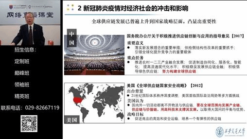 冯耕中教授以当前社会处于经济全球化和全球供应链发展的时代为切入点,讲述了全球供应链发展所引发的生产成本的全方位下降与效率效益的全面提升,使得整个世界保持“你中有我,我中有你”的紧密联系。并就此次新冠肺炎疫情的突然爆发和快速蔓延,对全球供应链带来前所未有全局性冲击展开讨论。他强调疫情所造 成的经济衰退引发需求萎缩,生产暂停限制产品供给,物流、资金等困难重重,全球供应链深陷断链风险,对我国经济社会发展影响巨大。
