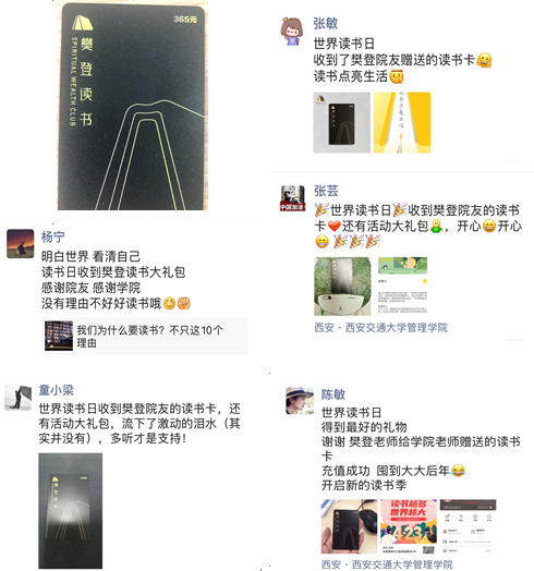 4月23日是世界读书日,樊登校友为学院教职工第二次捐赠了“樊登读书会”读书卡,受到了学院教师的欢迎和好评,在特殊的日子里收到一张有意义的读书卡,是樊登校友“饮水思源”的情怀,是鼓励多读书读好书的最好诠释。