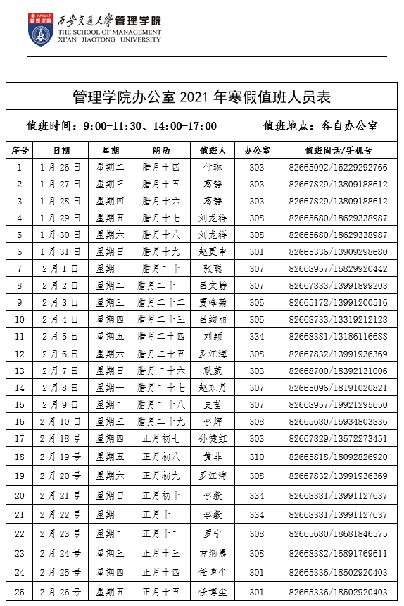 1、各行政部门安排好寒假期间值班人员,实验中心、教务中心、专业学位、各经营部门自行安排假期值班;安排值班的部门请将值班表于1月23日中午12点前报综合秘书方炳晨。