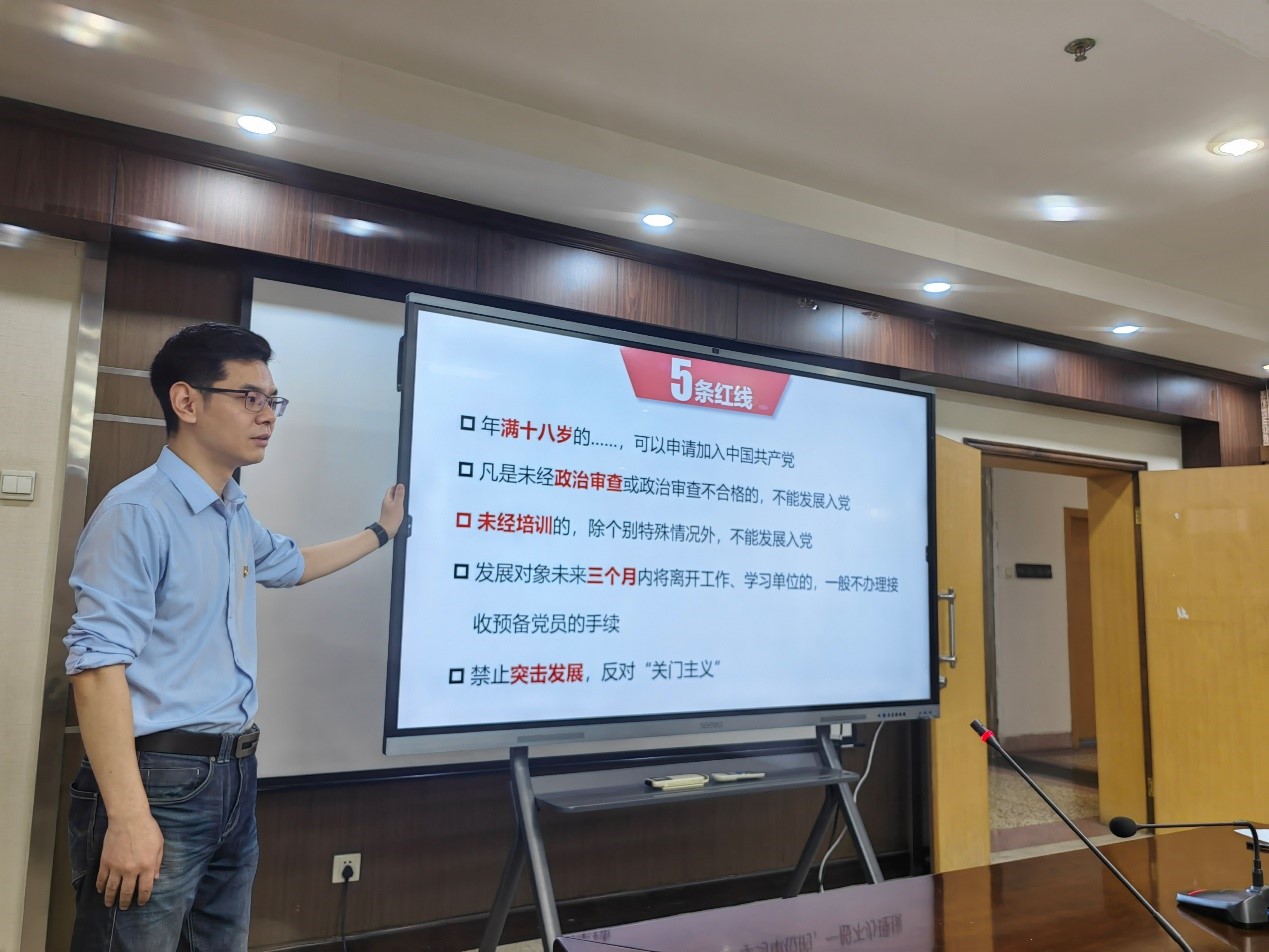 杨夫腾老师介绍了2009年以来学校发展党员的规模,讲解了学校2023年发展党员的计划,介绍了目前学校发展党员工作的重点,强调要真正吸纳优秀青年学生、知识分子尤其是高层次人才中的优秀分子。杨老师详细讲解了发展党员中的4个阶段25个程序,重点解读了5个节点以及重要的档案材料,对入党积极分子出国、预备期出国、预备期毕业该怎么处理等常见问题逐一进行了耐心解答。