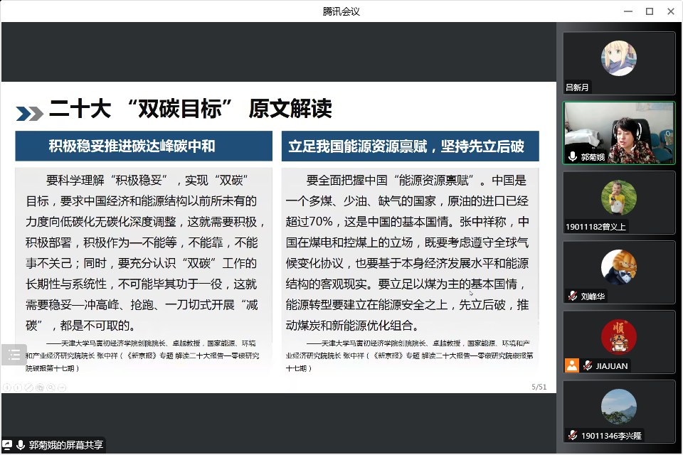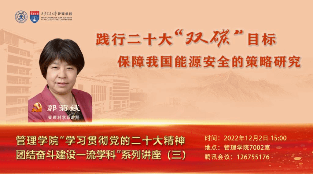 “学习贯彻党的二十大精神 团结奋斗建设一流学科”系列报告第三讲开讲。管理科学系郭菊娥教授以“践行二十大“双碳”目标,保障我国能源安全的策略研究”为题面向全院师生作报告。a漫