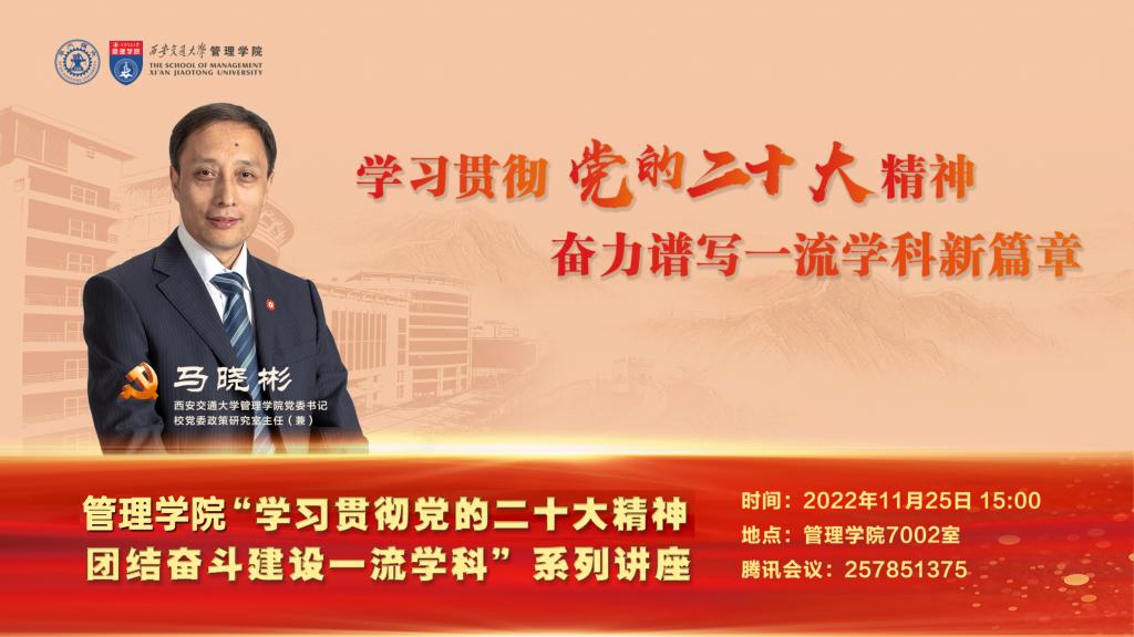 马书记强调,学习贯彻党的二十大精神是当前和今后一个时期的首要政治任务,全院师生党员:一要原原本本学,逐字逐句研读党的二十大报告原文以及习近平总书记系列重要讲话,推进党的二十大精神和习近平新时代中国特色社会主义思想进课堂、进教材、进头脑。二要全面系统学,全体党员要以身作则、率先垂范,在学懂弄通二十大精神上下工夫,主动承担起自身学习贯彻和宣传双重任务,更加自觉地运用党的二十大精神武装头脑、指导实践、推动工作。三要始终牢记为党育人、为国育才的使命,落实好立德树人的根本任务,促进青年学生德智体美劳全面发展。四要坚持“知行合一”,注重学用结合,切实把党的二十大作出的新部署新要求落实到人才培养、科技创新、人才队伍等学院主要工作中,强化学科内涵建设。他要求各支部要按照学校和学院党委要求,组织师生党员认真学习贯彻党的二十大精神,引导大家边学边做、边做边学,真正做到学懂弄通做实,立足自身岗位责任,助力推动学院高质量发展,为建设教育强国、科技强国、人才强国贡献管理学科的智慧和力量。