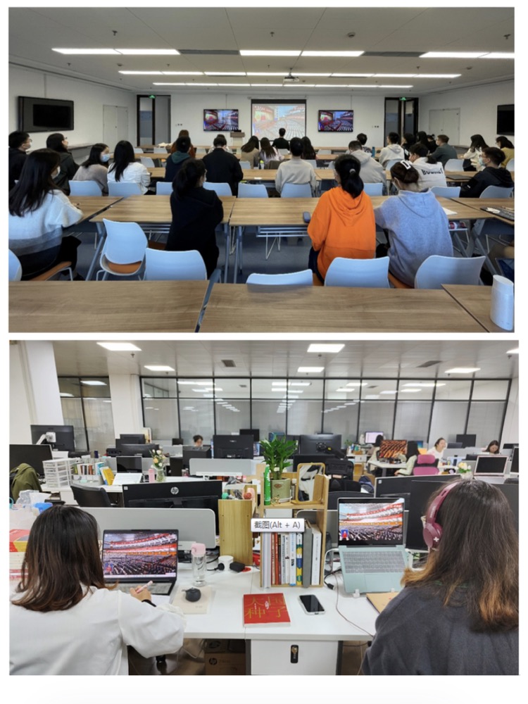 上午10点,雄壮的国歌声从电视直播中传来。在创新港涵英楼管理研究院,同学们在学习间隙,自发坐到教室、实验室的大屏幕前,聚精会神收看开幕会直播。