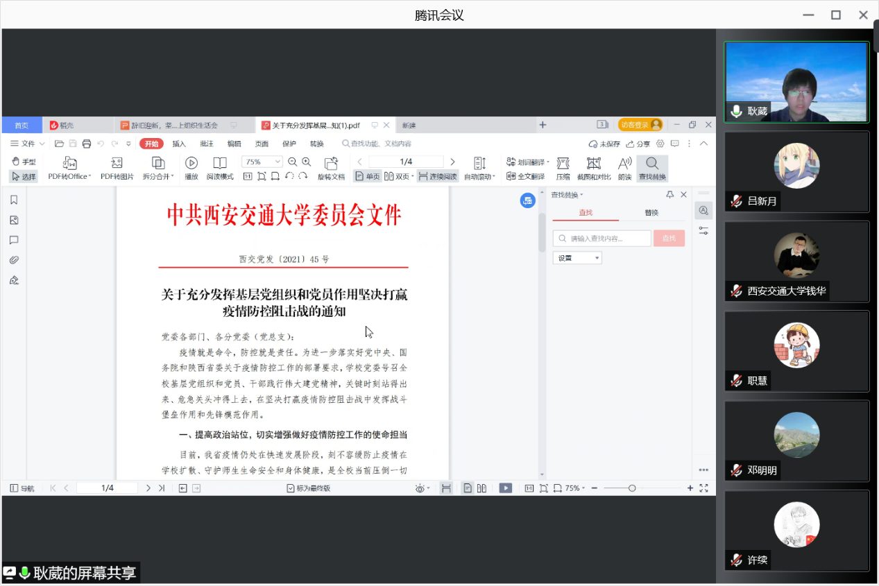 机关党支部召开线上专题组织生活会,传达上级部门和学校疫情防控工作领导会议精神,落实相关防疫要求。支部全体党员和积极分子参加,会议由支部书记耿葳同志主持。