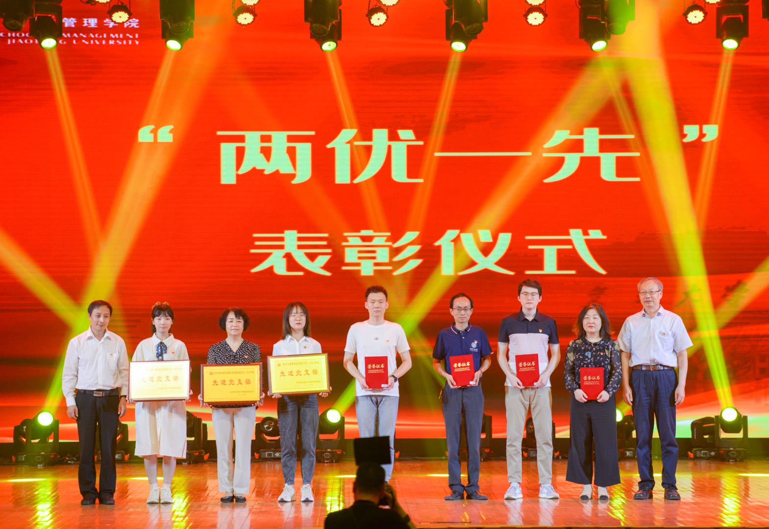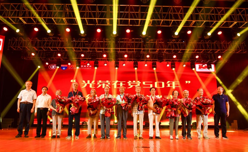 党委书记马晓彬、院长冯耕中共同为学院12位老党员颁发中共中央授予的“光荣在党50年”纪念章。他们半世纪兢兢业业为党工作,把全部心思和精力用在爱岗敬业,干事创业上,把自己生命中最珍贵的50年奉献给了党。老党员代表在师生的搀扶下缓步走上主席台,逐一接过勋章和鲜花。全场以热烈的掌声表达着对老党员的敬佩和向老党员看齐的决心。同时对学院获得“两优一先”称号的集体和个人、党史知识竞赛获奖的集体和个人进行了表彰。与会的党员同志和新发展党员在a漫