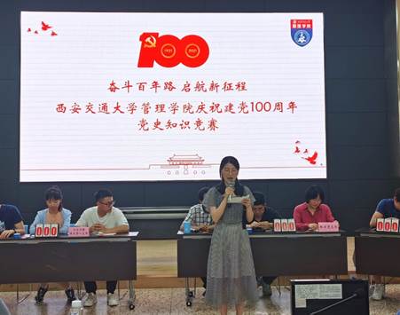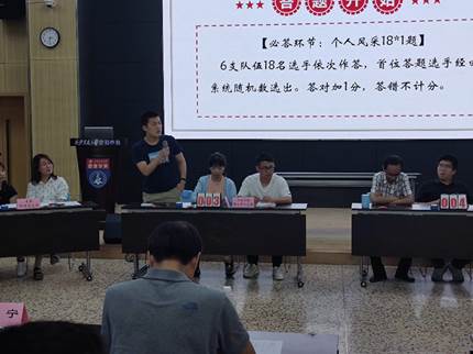 机关党支部、19级管科硕士支部、20级管科硕士支部、工业工程与运营管理师生联合党支部、专职科研党支部、工业工程博士第一支部。复赛答题分为必答题和抢答题两轮,每轮包括两个环节。首先,第一轮必答题的齐心协力环节,每支队伍抽签选出本队的必答题目。紧接着是必答题的个人风采环节,6支队伍的18名选手需要依次作答。