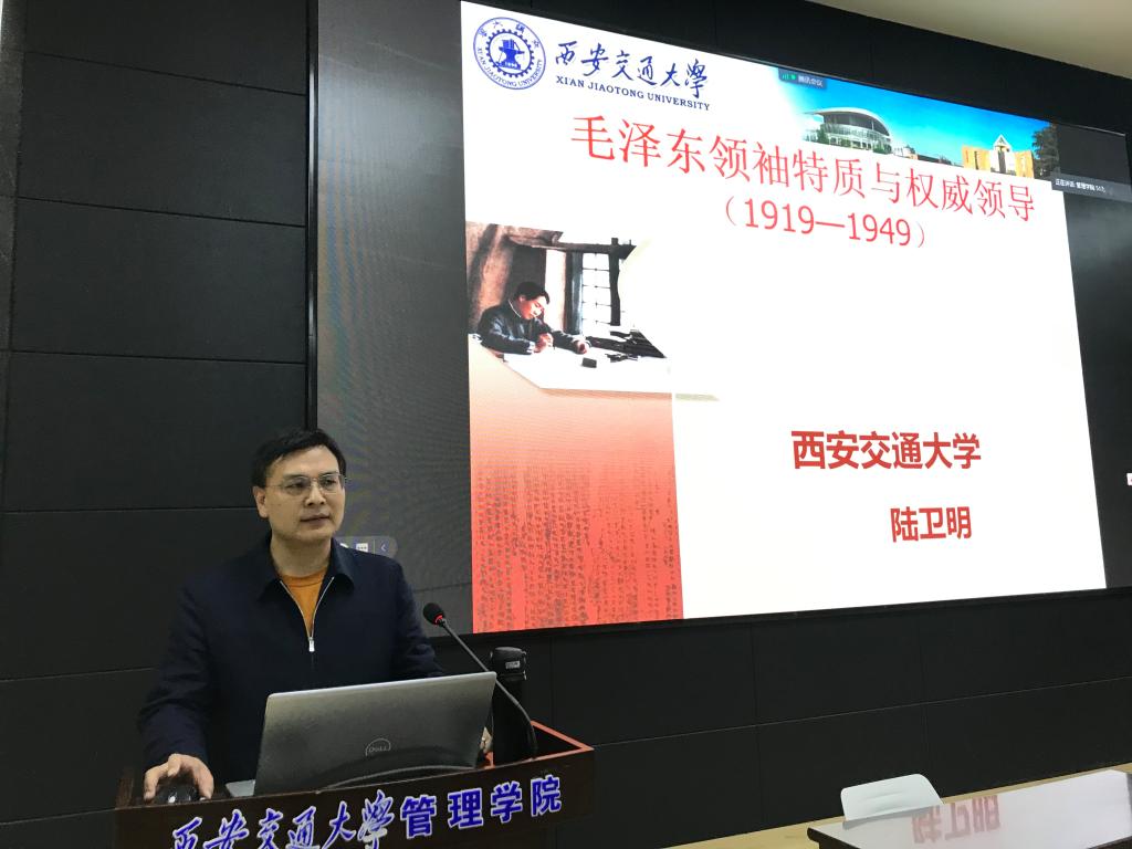 随后,马克思主义学院陆卫明教授为全体师生党员作“毛泽东领袖特质与权威领导(1919~1949)”的党史学习教育专题报告。陆教授结合历史学、政治学研究,基于政治文化的视角,从毛泽东个性特质出发,对他的权威领导的形成、巨人诞生的条件及其对中国社会历史所产生的重大影响作了全面系统的阐释,使师生党员更深刻的学习了解中国共产党砥砺奋进的光辉历程。