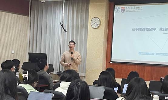 首先,马宇飞同学对自己过往的丰富经历做出了分享,他积极投入志愿活动,曾在内蒙古自治区支教一年。返校之后又积极投入到科研学习和学校相关工作中,围绕个人研究方向展开研究,参与重大社科项目、国家自然科学基金、专著撰写等。同时也就任校团委校园文化中心副主任,多次举办相关活动。他指出内蒙古支教的这一年经历对自己现在所取得的成绩影响深远,不断地激励着自己迎接挑战。同时他也对学校、老师们在自己成长道路上提供的帮助表示了真挚的感谢,希望继续通过奋斗,向优秀之人看齐,成为更好的自己!