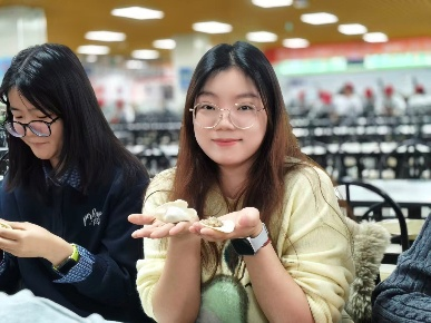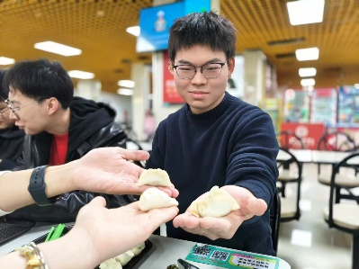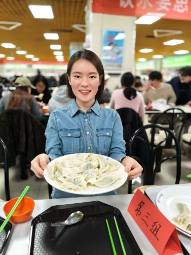 在等待煮饺子的间隙,“速度包饺大比拼”火热开赛,每组派出的包饺子“高手”都拿出了浑身解数在比赛区域飞速地包着。指尖翻飞间,一个个饺子快速成型。随着比赛如火如荼地进行,饺子的鲜香渐渐弥漫整个食堂。