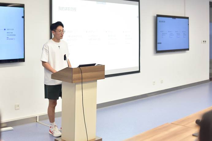 贾梦超同学以自己研究生期间的经历和态度转变为切入点,告诫同学们首先应做到的就是认清自己的目标,认清自己适合并且想要从事哪类行业和岗位。他根据自己的实习经验,强调实习的岗位和目标的就业岗位应该存在一致性。针对同学们可能对证券行业不甚了解的情况,分别从证券职能分类的前台、中台、后台,以及营业范围分类的股权线,债券线谈起,让大家对证券行业有了一个基础且整体的认识,方便对此有意向的同学细化自己的目标职务。最后,他对从事证券行业有意向的同学提出了一些准备建议(如学习CPA会计,财务建模,估值等)。