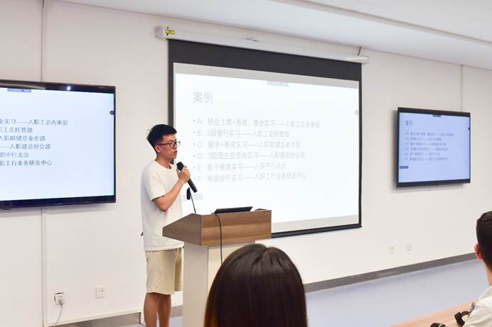 张为栋同学介绍了银行相关的求职经验,从国内银行的几大分类、不同类型银行的入职难度,入职发展、银行内的组织架构等方面做了自己的经验评述。同时,他强调了银行的面试和笔试非常重要,对此他也详细介绍了笔试考核的内容和面试的一些独特之处,比如双盲制的面试方式。并提醒同学们应做到了解自己,了解对方,放平心态,勇敢试错。