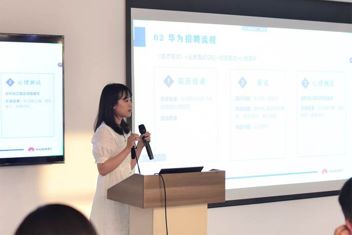 第一位分享的同学是刘楚,作为本次活动的开场嘉宾,她详细向大家介绍了华为的面试流程和面试时间。为大家科普了日常实习和暑期实习的很多区别和注意的点。在面试准备方面,她强调了行测和简历制作方面的常见误区,最后推荐了offershow求职咨询平台以及超级简历的简历排版软件,建议中肯,干货满满。