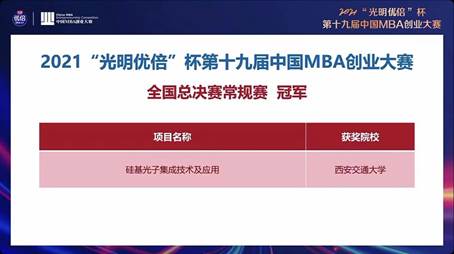 2021年10月24日,2021“光明优倍”杯第十九届中国MBA创业大赛全国总决赛在上海举行,来自全国各分赛区的14支晋级队伍参加了常规赛比赛。经过一天激烈的角逐,a漫 代表队凭借《硅基光子集成技术及应用》项目一举夺魁,获得本届中国MBA创业大赛全国总决赛常规赛冠军,创造了我校在该项赛事中的最好成绩!