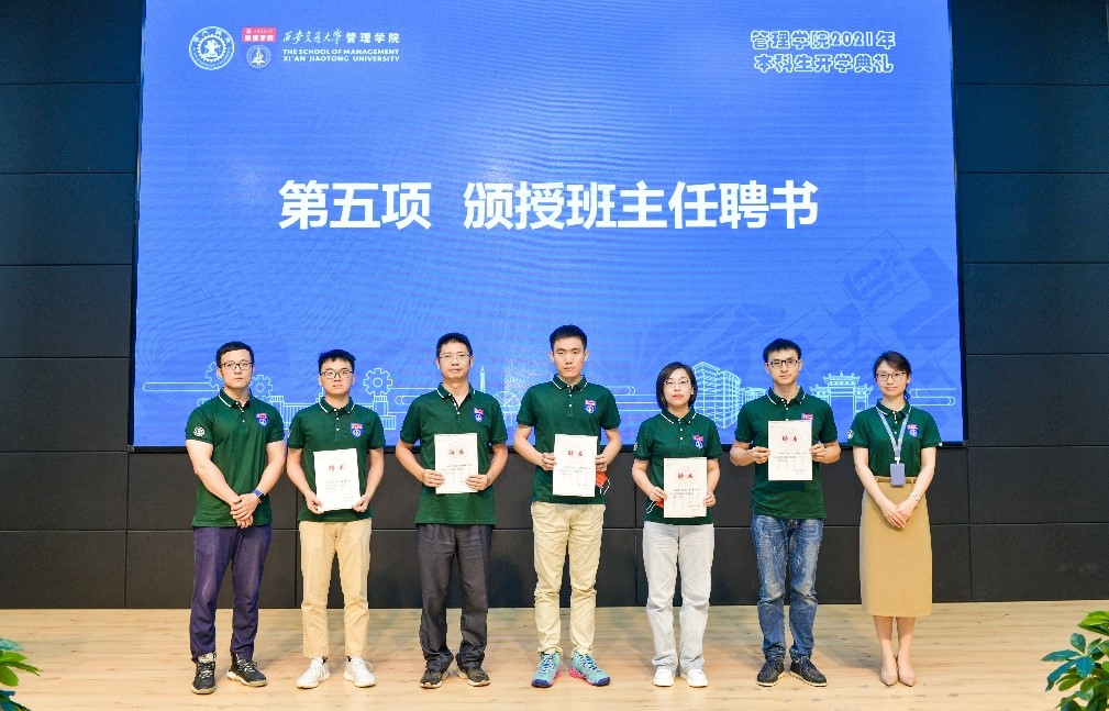 接着,举行了颁授新生班主任聘书仪式,冯耕中院长和张丹院务主任、叶宁副书记和段继超副主任分别为2020级和2021级班主任颁授了聘书。