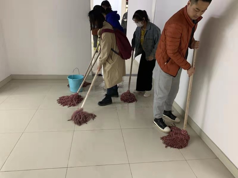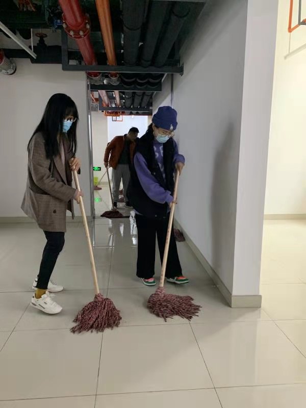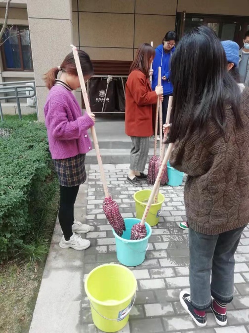 惠园公寓底下共享空间面积很大,而且目前尚未通水,也没有排水管道。为了高效完成“任务”,同学们进行分工和分组。几位男同学每人拎着一个水桶,从一楼房间接满水送到地下。其他同学则使用拖布进行清扫。同学们两三人一组,各负责一个单元的面积,热火朝天的干了起来。期间,送水的男同学们不停往返换水,积极做好“保障工作”。