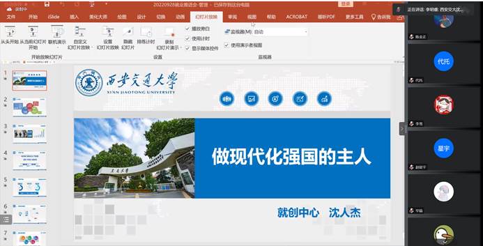 会议开始,就创中心沈人杰对当前的就业形式进行了深入分析,指出受疫情影响,今年就业形势严峻,竞争更加激烈,同学们要认清就业形势、尽早明确职业发展规划、主动出击、充分做好求职准备。最后,沈老师分别就简历准备、信息获取以及面试技巧等方面提出了指导建议。