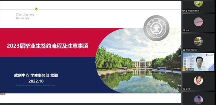 就创中心孟勤老师给同学们梳理了未来一年内求职活动的重要时间结点,并向大家详细介绍了2023届就业信息系统、毕业生网签流程以及2023届就业派遣政策等内容,针对大家在网签过程中可能遇到的问题进行解答。