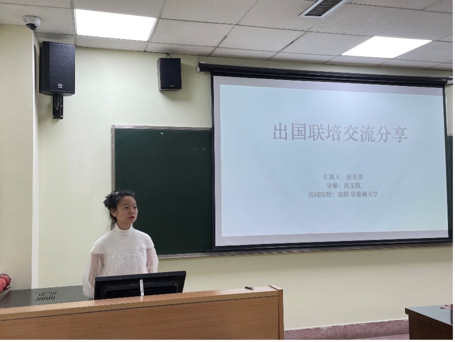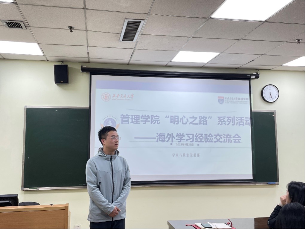 前往美国华盛顿大学福斯特商学院交流学习一年的赵若男同学的分享主要聚焦两个方面。一是充分利用留校期间学校的资源。首先可以通过听讲座来拓宽关注面,了解前沿的研究进度以及不同学者产生idea的方式。其次是上课时积极主动参与讨论。可以通过讨论来快速、较大的范围回收问题和答案,验证自己的科研思路与逻辑。通过讨论来了解大家思考的切入角度,从而构思自己的写作思路。二是如何平稳度过科研低谷。在面临所处环境发生变化时,可能情绪有一些波动。但还是要保持学习,维持生活节律,建立对生活的控制感,努力恢复自身的能量来解决情绪的疲惫。她建议同学们打开社交圈,跟同学们一起学习,不要给自己设限。