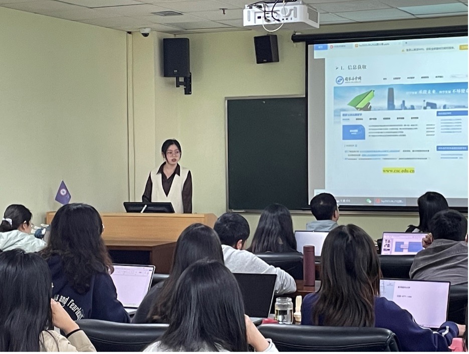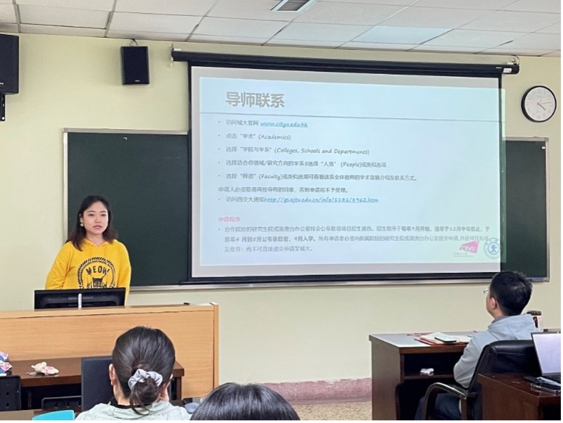 参加香港城市大学IS系联合培养项目的方舒祎同学针对联培的学制、课程结构、项目要求和培养方式及申请时的注意事项进行介绍。同时也向同学们讲解了在香港就学时的经济补助和就学支持。此外,方同学针对如何联系老师进行详细阐述,并强调申请项目前一定要征得自己导师的同意。