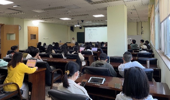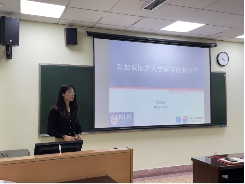 参与新加坡国立大学(NUS)联合培养博士生项目的周海迪同学对NUS商学院及自己跟随的导师进行了介绍,并分享了自己的科研成果进展情况。此外,周海迪还展示了NUS的工位和图书馆环境,并谈到在这里参加年轻学者讲座,收获颇丰。
