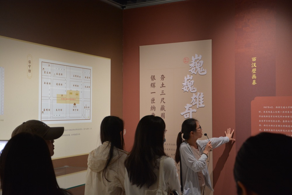 踏入展厅,一幅描绘1955年5月10日左右五位教授勘查新校址的场景的《踏勘校址》油画率先映入眼帘。展览以“千年地缘”“巍巍雄奇”“文脉交融”“南洋泱泱”四大篇章,串联起学校与古都长安的文明共鸣。“千年地缘”展现校址所在的唐长安城道政坊、常乐坊的千年文脉,通过《踏勘校址》油画重现西迁选址场景,彰显前辈“建设大西北”的决心。“巍巍雄奇”以西汉壁画墓(最早二十八宿星图)、唐代银器、明代宦官墓等考古发现,呈现校园土地上跨越千年的历史遗存。“文脉交融”以丝绸之路为脉络,通过都管七国银盒、梵文石碑等文物,诠释长安作为文明十字路口的开放包容精神。“南洋泱泱”回溯从1896年南洋公学创立到西迁壮举、创新港发展的百年历程,展现交大人“与民族共奋进”的精神谱系。