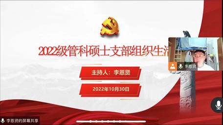 10月16日至22日期间,中国共产党第二十次全国代表大会胜利召开。10月30日,2022级管科硕士党支部以线上会议的方式召开专题组织生活会,学习二十大报告。本次会议由支部书记李恩贤同志主持,支部全体党员与积极分子参加了会议。