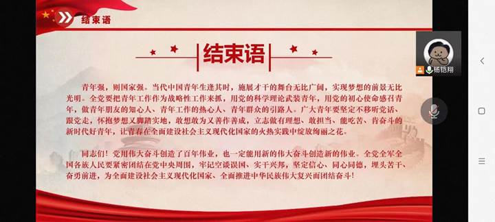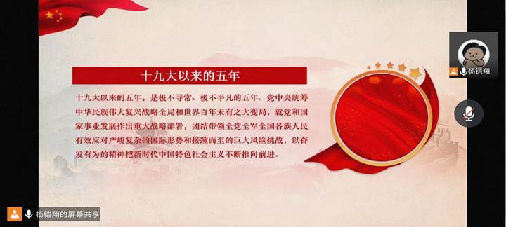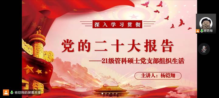 为贯彻落实《中共中央关于认真学习宣传贯彻党的二十大精神的决定》,全面系统地学习党的二十大精神,深刻领悟党的二十大关于党和国家事业发展大政方针和战略部署的历史逻辑、理论逻辑、实践逻辑, 10月30日晚8点,2021级管理科学与工程硕士党支部于线上开展了组织生活会,进行了党的二十大精神专题学习。本次组织生活会共有35人参加学习,由党支部书记杨铠翔主持并领学。
