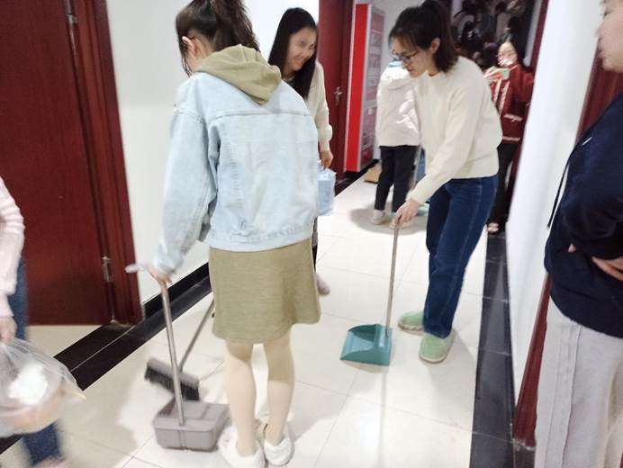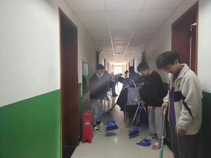 下午1点,活动开始。男生负责打扫教二的1层到7层,女生负责打扫西21楼的10层到16层共计14个楼层。在同学们的共同努力下,宿舍楼的走廊、楼梯、公共卫生间等地的卫生得到了有效改善,赢得了其他同学的一致好评。