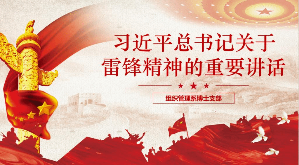 会议第二项由组织管理博士支部书记李卓璟带领支部成员学习“习近平总书记关于雷锋精神的重要讲话”。李卓璟同志从“无论时代如何变迁雷锋精神永不过时”、“让学雷锋活动融入日常、化作经常,让雷锋精神在新时代绽放更加璀璨的光彩”、“见贤思齐,把雷锋精神代代传承下去”及“雷锋精神对当代社会的影响”等四方面展开,在与会成员心中播撒“全心全意为人民服务”的种子。