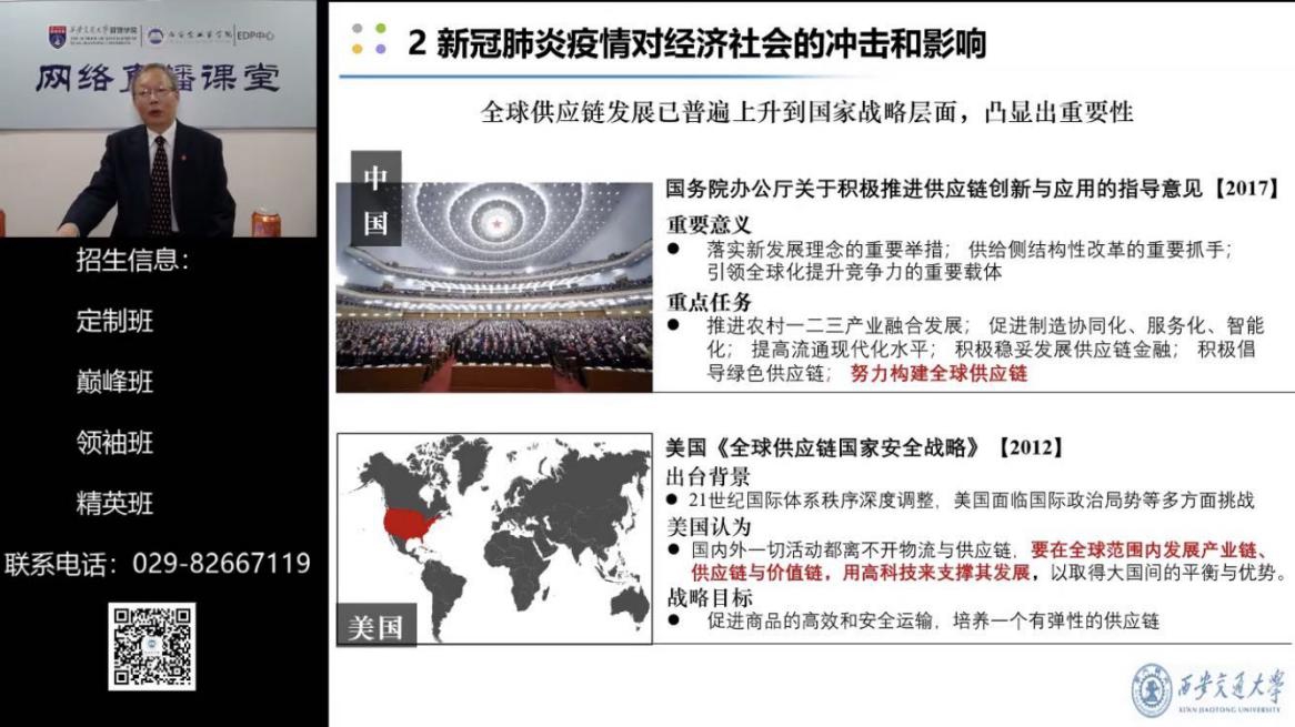 院长、西安企业家学院院长冯耕中教授以“新冠肺炎疫情对经济社会的影响:基于供应链视角的分析”为题,与在线人员一起重点分析讨论了如何理解新冠肺炎疫情对经济社会的冲击和影响程度?如何应对新冠肺炎疫情的影响和实现经济恢复发展?后新冠肺炎疫情时代国际社会的变化和中国的发展策略等当前热点问题,受到了广泛好评。市委统战部,市发改委,市国资委,市科技局,市工信局,市大数据局,市商务局,市投资合作局,市金融工作局,市军民融合办公室,市科协,市工商联,市属国有企业,西咸新区及各开发区、各区县相关部门,相关领域民营企业家参加培训,在线人数达到8000多人次(三个直播平台)。