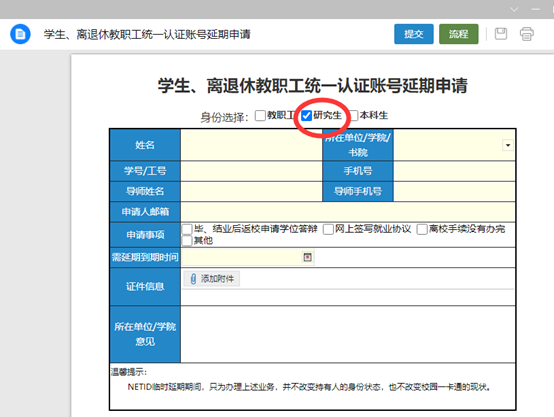 4、找到“学生、离退休职工统一认证账号延期申请”