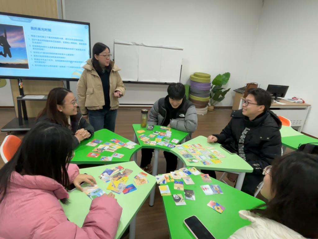 培训伊始,赵颖老师以欧卡自由解读环节打破陌生感,引导学员们在尊重理解的基础上挣脱“对错”束缚,围绕卡片图案与色彩畅所欲言。有的同学从卡片中联想到日常片段,有的透过图像传递内心情绪,现场迅速构建起开放包容的沟通氛围,为后续深度互动奠定了坚实基础。核心体验环节中,赵颖老师设计了一系列沉浸式活动,让同学们在实践中感悟成长。在“故事接龙”环节,大家以欧卡为线索,合力编织出一个个充满想象力的故事,在协作中提升了沟通默契;“高光时刻与人生低谷”分享环节里,大家手持精心挑选的欧卡,真诚袒露求学路上的成就与迷茫、挫折与坚守。当有同学谈及考试失利后的自我怀疑、初入校园的适应焦虑时,同组组员们专注倾听,以共情的话语给予安慰,用自身经验分享实用建议。而“高光时刻”的分享则满溢正能量,大家通过卡片传递成就感与勇气,彼此激励前行。现场涌动着理解与支持的温暖力量,让每一位分享者都感受到被接纳、被看见。培训在温馨的互赠卡片环节落下帷幕,大家基于全程的深度交流与深刻理解,精心挑选欧卡卡片赠予身边同学,附上贴合对方特质的祝福与期许。一张卡片承载一份认可,一句寄语传递一份温暖,让情感在传递中升华,也让彼此的联结更加紧密。赵颖老师全程精准引导,结合欧卡投射原理,为学员们解析情绪表达与沟通技巧,助力大家掌握倾听共情、情绪疏导的实用方法,明确心理委员的职责定位。