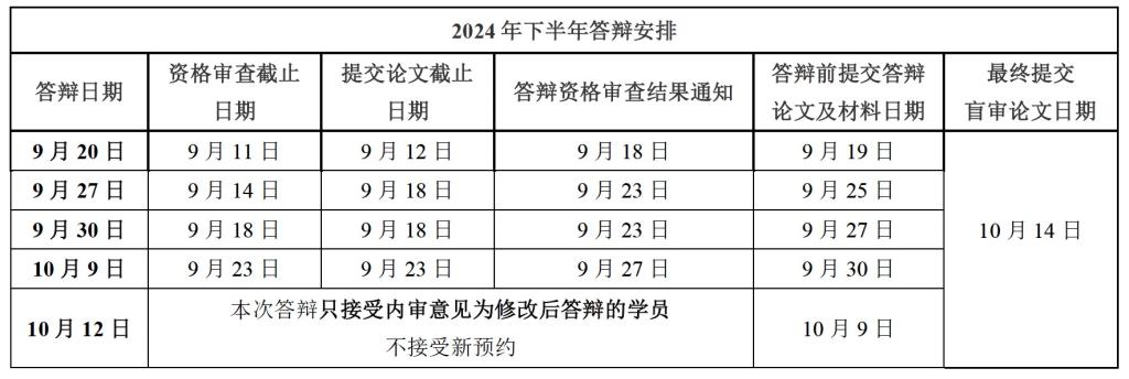 2024年下半年MBA/EMBA论文集中答辩时间为:9月20日(周五)、9月27日(周五)、9月30日(周一)、10月9日(周三)、10月12日(周六),共五次。