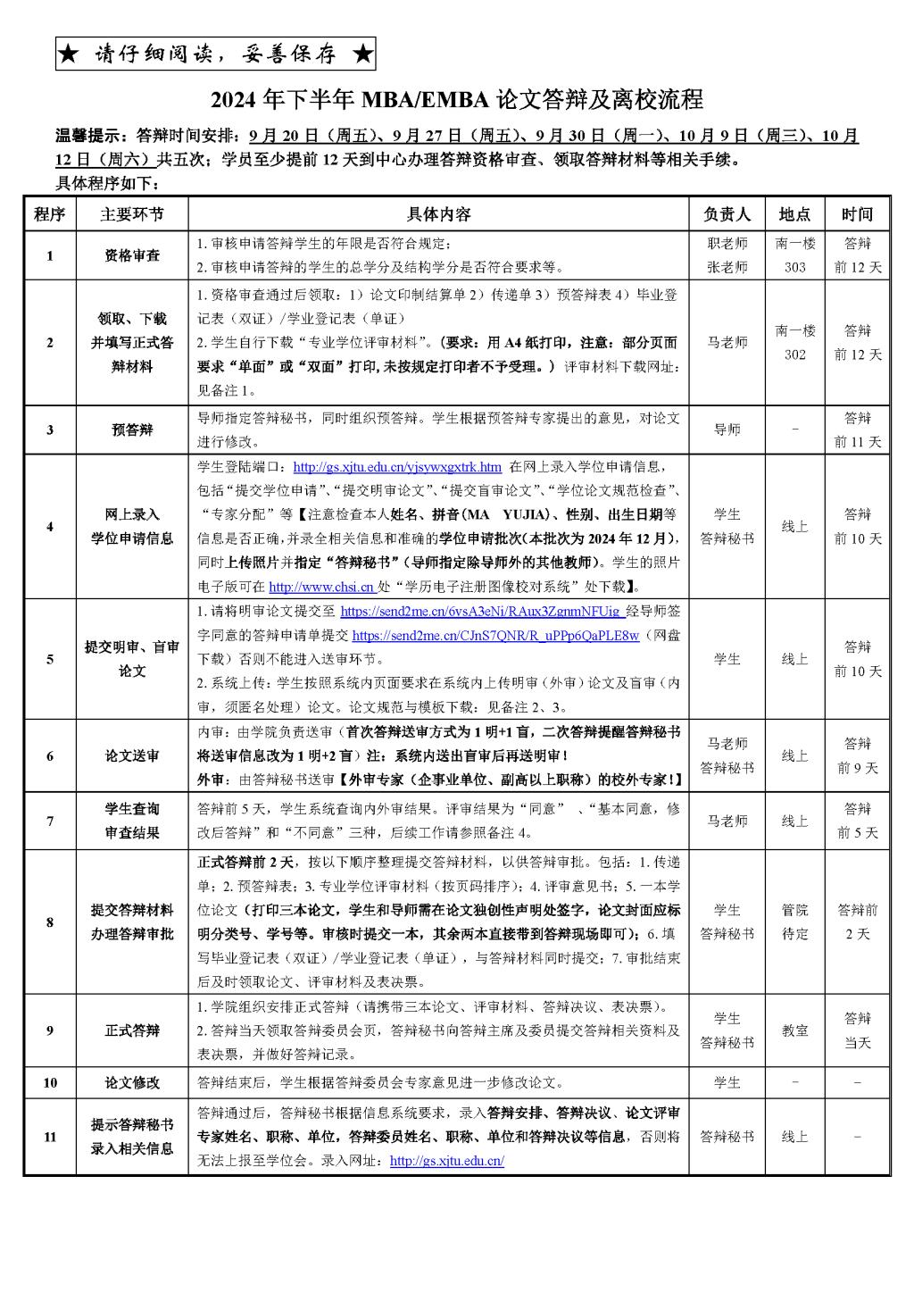 2024年下半年MBA/EMBA论文答辩及离校流程