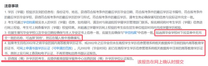 4.考生可在网上报名期间查看学历(学籍)校验结果。为确保核验顺利,建议考生提前登录“中国高等教育学生信息网”(网址://www.chsi.com.cn)查询本人学历(学籍)信息。未能通过学历(学籍)网上校验的考生,应在招生单位规定时间内按要求完成学历(学籍)核验。