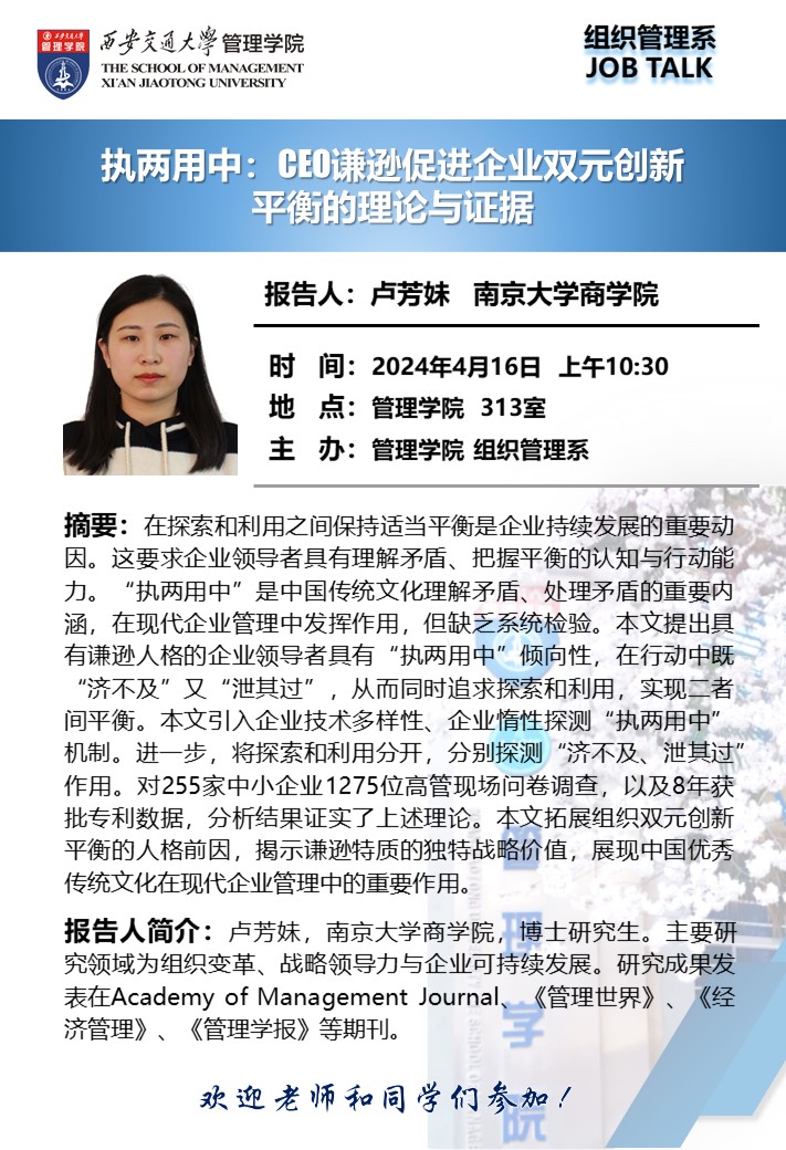 讲座:执两用中:CEO谦逊促进企业双元创新平衡的理论与证据