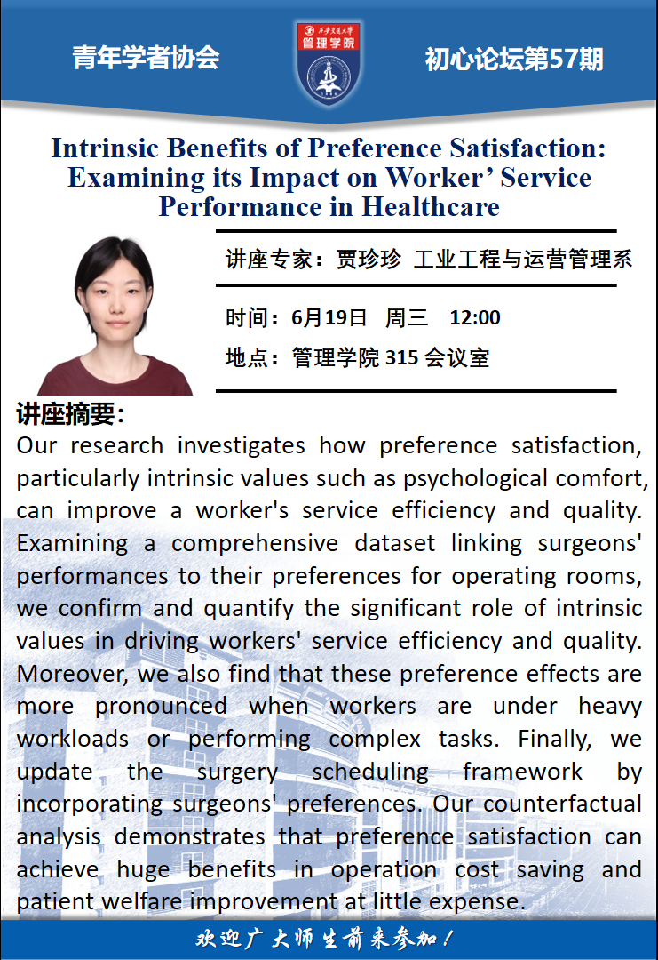 讲座:Intrinsic Benefits of Preference Satisfaction: Examining its Impact on Worker’ Service Performance in Healthcare 2024-06-18