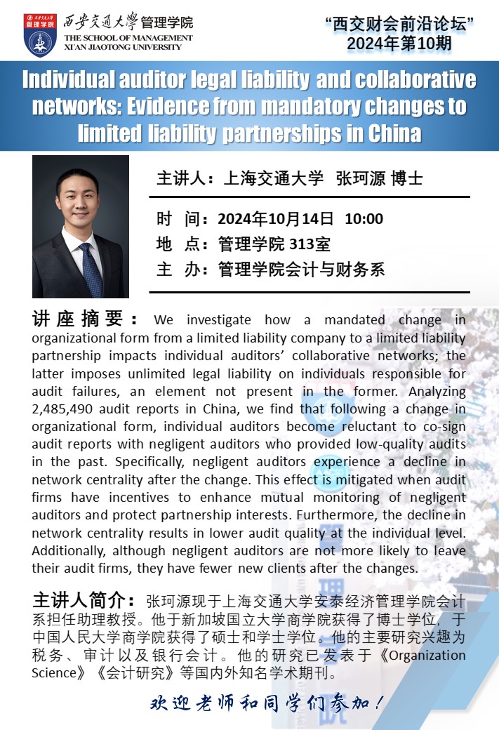 【时间调整】Individual auditor legal liability and collaborative networks: Evidence from mandatory changes to limited liability partnerships in China 2024-09-30