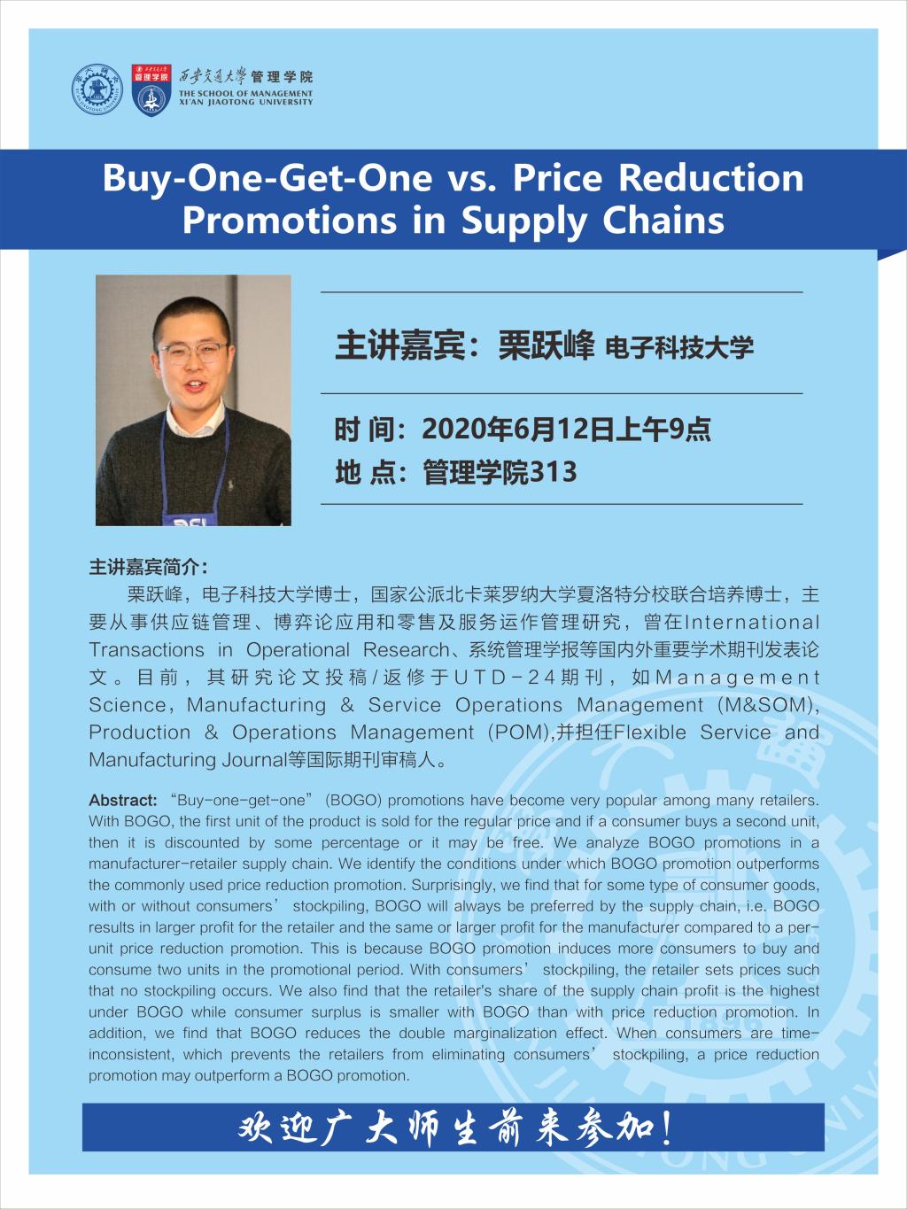 讲座通知:Buy-One-Get-One vs.Price Reduction Promotions in Supply Chains