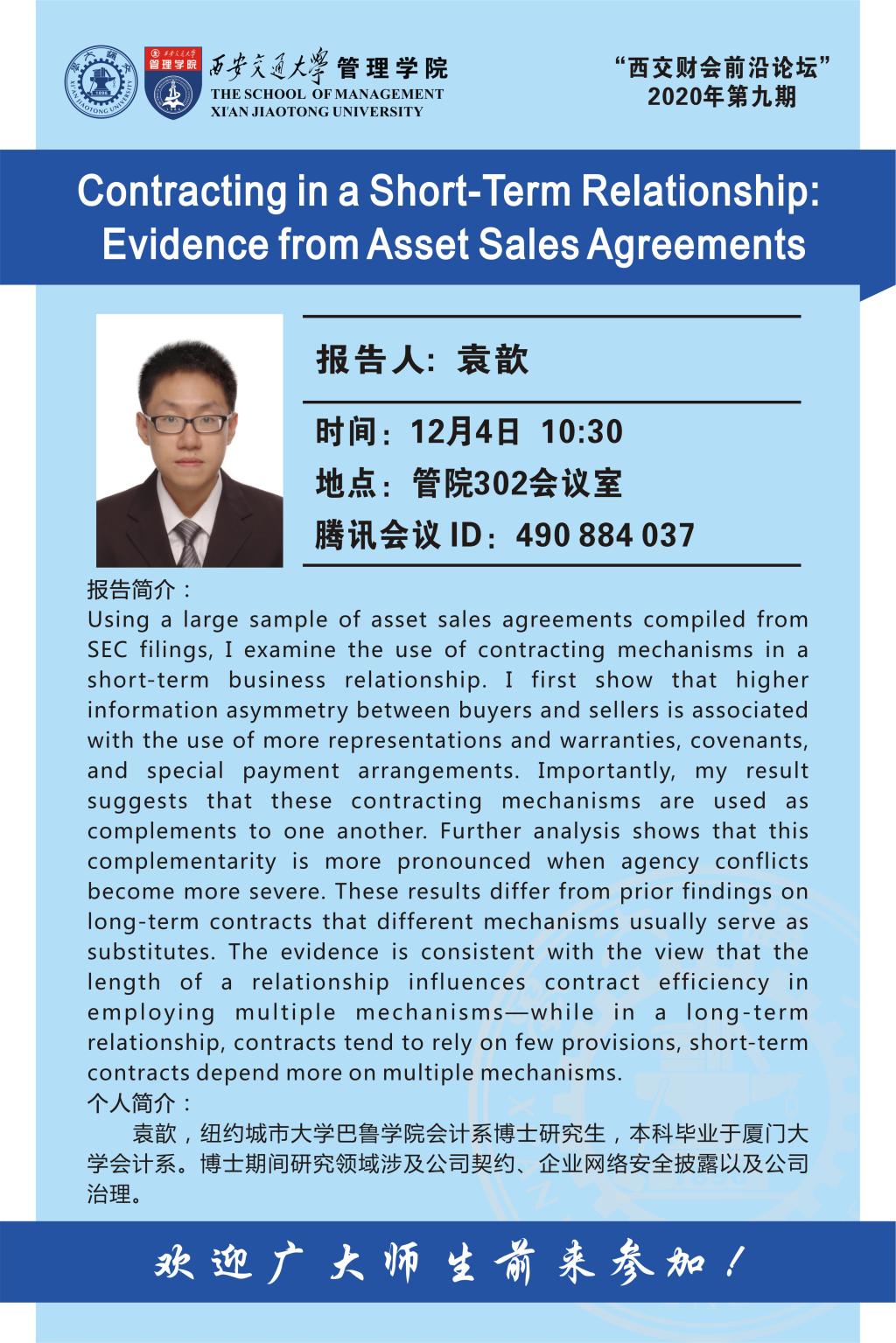 “西交财会前沿论坛” 2020年第9期:Contracting in a Short-Term Relationship:Evidence from Asset Sales Agreements 2020-11-30